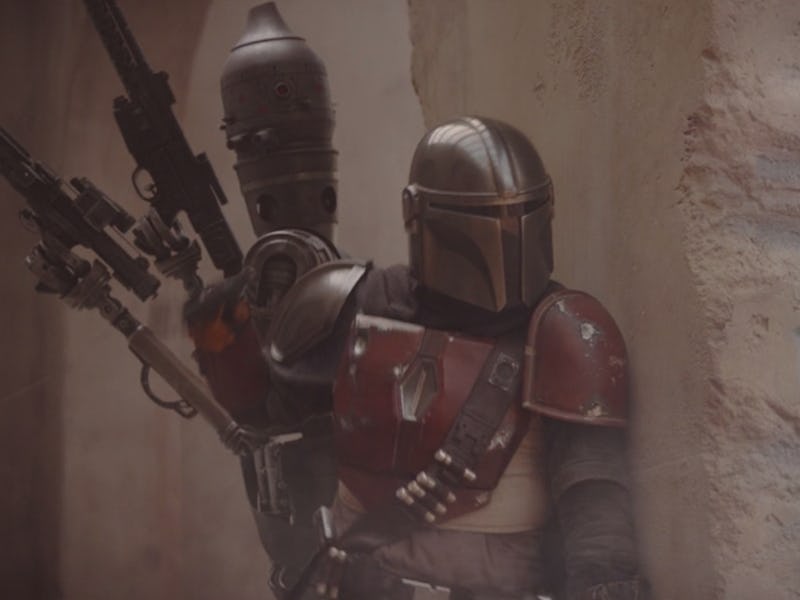 “Droids,” the Mandalorian says with a loud, exasperated sigh. The two briefly team up, but Mando grows quickly frustrated with the droid, who has more of a robotic personality than the likes of other robots from Star Wars history.