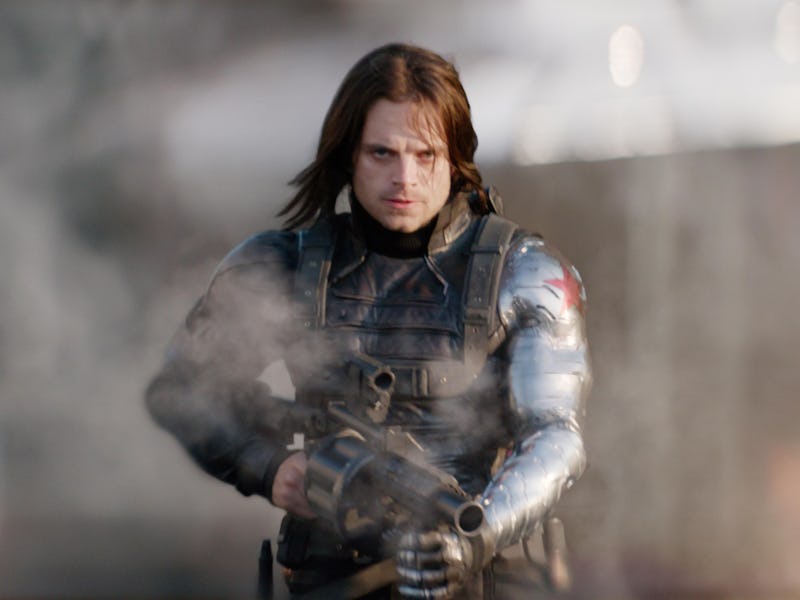 On Tuesday, a Marvel fan on Twitter, @yelenatswhore, tweeted a photo, allegedly taken by their music teacher, of Sebastian Stan in his new Winter Soldier costume. In addition to his black and gold Vibranium arm, the Winter Soldier has added a chest harness (reminiscent of his old pal, Captain America) with new dark brown pants and boots.