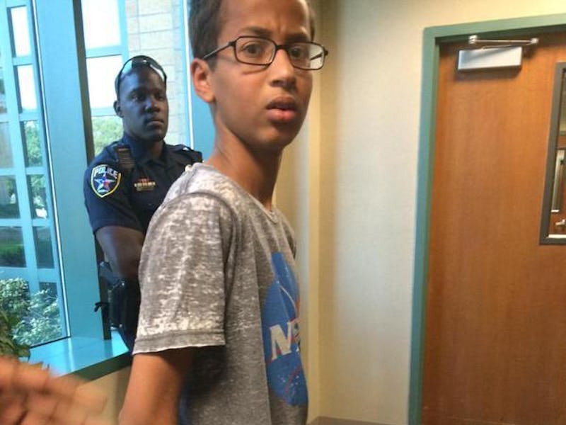On Monday, police arrested the MacArthur High student for bringing a harmless homemade digital clock to school. A photo of the bright young tinkerer (wearing a NASA tee) handcuffed exploded across social media and #IStandWithAhmed.