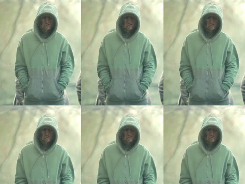 In the immediate aftermath of that attack, chaos ensues, but the camera zooms in on one man who seems unnaturally calm. Or at least, we think it’s a man. Dressed in a green hoodie with what appear to be bandages covering his face, this hooded man stares straight into the camera.