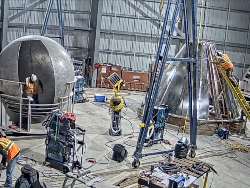 The image shows the vehicle’s oxygen tank and nose cone are well-underway — together they make up the forward-most part of the rocket.