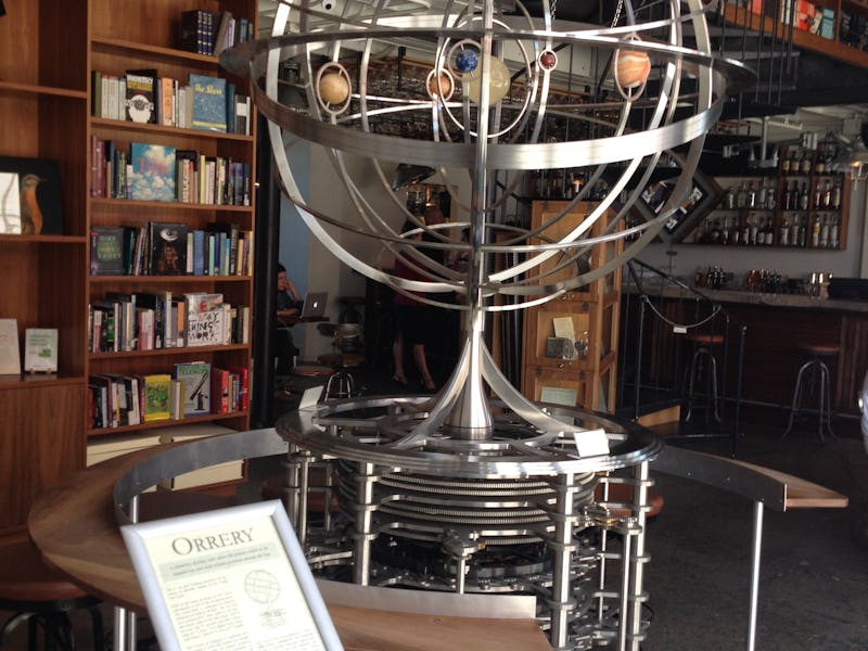 There have been three working prototypes. This one, currently in the Interval’s main entrance, uses rotating planets to mark the time. There’s only one problem: Unlike in a normal clock, you can’t see time tick by. But that’s the point: To remind the bearer that time moves slowly, that despite a culture and economy increasingly obsessed with (profits to be gained by) the Nano-Now, it’s crucial that we recalibrate, constantly, and remind ourselves that the Long Now is the one worth playing.