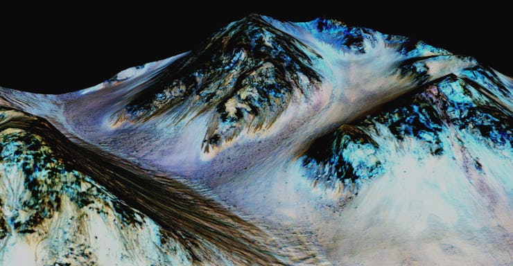These RSLs are in challenging areas, so you can’t just send a rover out to these cavernous spectacle to take a look and see if it’s water. Ojha and his colleagues turned to an instrument on the Reconnassiance Orbiter capable of making spectroscopic measurements of the surface of the planet — which basically means using wavelengths to determine the geological and chemical composition of what’s in the rock. They specifically looked at the signs of hydrated salt in four different RSL locations, in which salt disappeared as the RSLs would subside in the cold months.