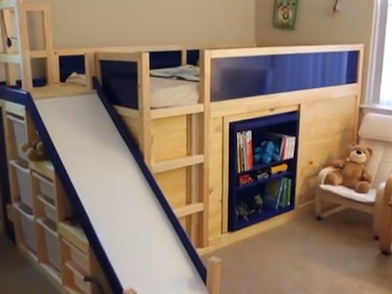 Strong made a play-by-play video that details how he used two IKEA Kura beds, a Trofast storage shelf, and a Besta shelving unit to make his son the holy grail of childhood sleeping centers. The D.I.Y. masterpiece boasts a slide, toy pulley and crane, ball run, and secret door that leads to a hidden room illuminated by soft, ultraviolet light.