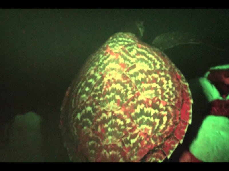 Actually, it’s something arguably cooler — the critically endangered hawksbill sea turtle, showing off a green and red biofluorescent glow while swimming around in the water.