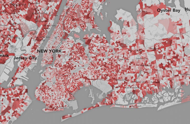 A map of the estimated homes at risk based on public data sets. The darker the region, the higher the risk.