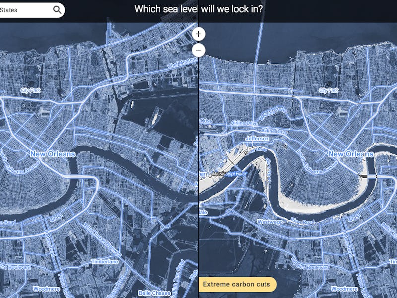 Sea levels in New Orleans projected for the year 2100 if we continue on course and if we make extreme cuts in carbon emissions. View interactive map at choices.climatecentral.org.