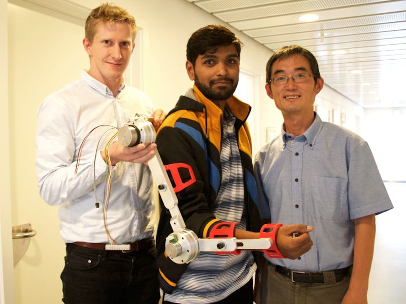 Team members Simon Christensen, Muhammad Raza Ul Islam, and Shaoping Bai demonstrate the first model of a portable robotic arm.