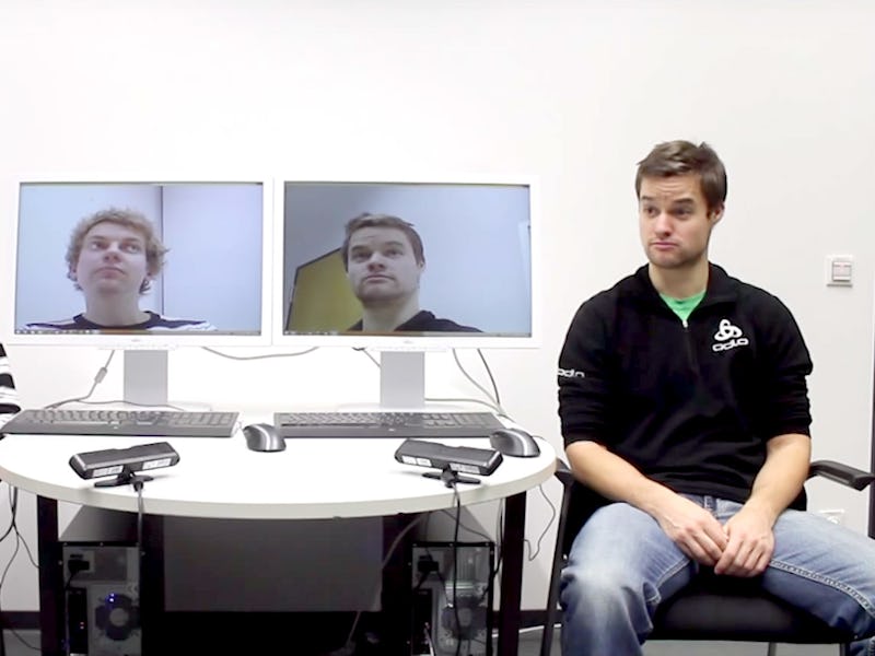 Since this system is still in the works (and pretty rudimentary equipment was used), the end results are still a little uncanny — like the semi-disturbing faux teeth the program superimposed inside the target’s mouth so there’s not a gaping black hole when it’s “open” (see above)… as well as the sort of blank look in the target’s eyes. But those are small fries compared to what cool things the development of this program means for us.