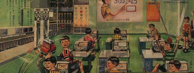 In “The Rise of the Computerized School” by futurist Shigeru Komatsuzaki, we find a group of (mostly) eager youngsters seated at desks equipped with personal touchscreen devices learning from an interactive digital math curriculum. At the head of the classroom, the teacher is beamed into the class on what seems to be a large flat-screen panel to give instruction. Noticeably absent are books and wires.