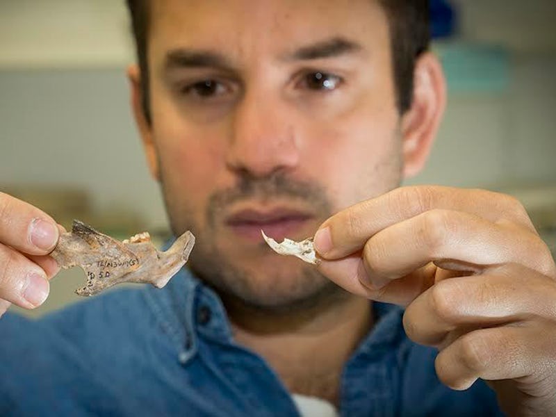 Dr. Julien Louys holds the jaw bone of an extinct rat species discovered on East Timor (left), in comparison with the same bone (right), taken from a modern rat.