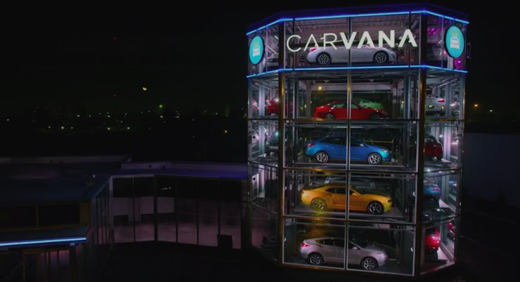 Carvana’s website offers all the steps you’d normally associate with buying a car online — selecting make and model, setting up financing, getting a warranty, and signing the contract — but then takes the whole deal to the next level by offering you the option of picking up your car the same way a teenager one week out from prom night buys a Proactiv Emergency Blemish Relief System next to an Auntie Anne’s Soft Pretzel stand at the mall.