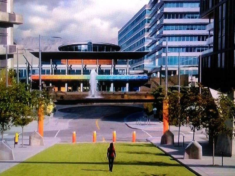 Inside where Matt Parkman is trying to get the tied-up Farrah to tell where Malina’s heading. He points a gun at also-tied-up Carlos to get Farrah to spill.