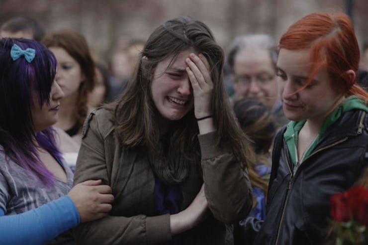 Eagle-eyed internet conspiracists claim to have spotted the same “tragedy brunette” in photos taken in the aftermath of the Aurora and Sandy Hook shootings, the Boston Marathon bombing, and, recently, the attacks on Paris. She’s an attractive woman in her early to mid-twenties with thick eyebrows, an aqualine nose, and a strong chin. In pictures, she’s crying.
