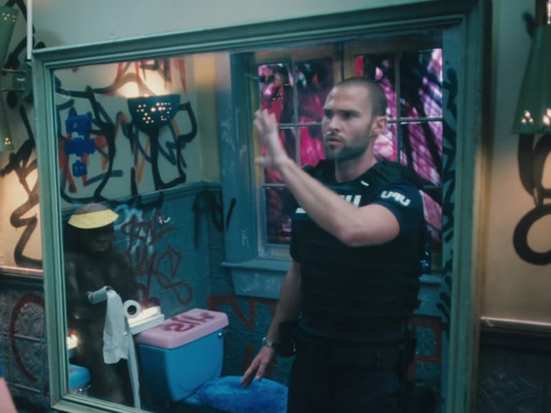 The simplest and least inaccurate way to explain this movie away is calling it a document of Bush-era paranoia. There are surveillance cameras and CCTV screens in nearly every scene. Multiple newscasts play at once, TV shows and ads pop into the frame to block others, and everything is branded with garish logos — military tanks are inscribed with the HUSTLER header. Everyone seems to be sapped of self-awareness or an understanding of their role and agency in a disordered universe. Vice-presidential candidate and U.S. Senator Bobby Frost (R-TX) even does a Bush impression — even though W is still meant to be in office — and breeds fear of terrorism and moral degradation in rhetoric dotted with snippets from “Stopping by Woods on a Snowy Evening” (get it, Bobby Frost? Robert Frost?). Military snipers watch over Los Angeles on parapets.