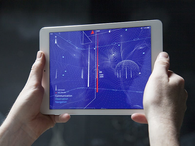 Vijgen’s infosphere comes from a dataset of 7 million cell towers, 19 million wifi routers, and hundreds of satellites. Based on your GPS location, the app visualizes what all that floating activity looks like — it’s not actually a depiction of the electromagnetic waves.