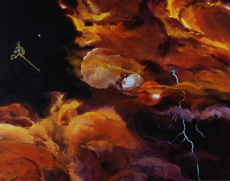 Once there, Galileo let loose a 750-pound probe that fell toward the planet’s core, traveling at over 106,000 miles per hour, behind a heat shield that hit nearly 28,000 degrees Fahrenheit. The probe descended into the top layers of the Jovian atmosphere for about 58 minutes, supplying a glut worth of data on the local weather and climate of the planet, before being destroyed.