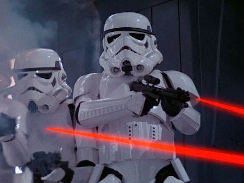 If you go back to the original, the blasters in the 1977 movie looked like straight-up guns. Squint hard enough and the gun metal, handle, and trigger all look like the weird plausible cousin of an AK-47 or something. Again, the actual deaths caused by handheld blasters in the original movies were bloodless and typified by sparks, a puff of smoke, and a Wilhelm Scream. Stormtroopers don’t bleed out.