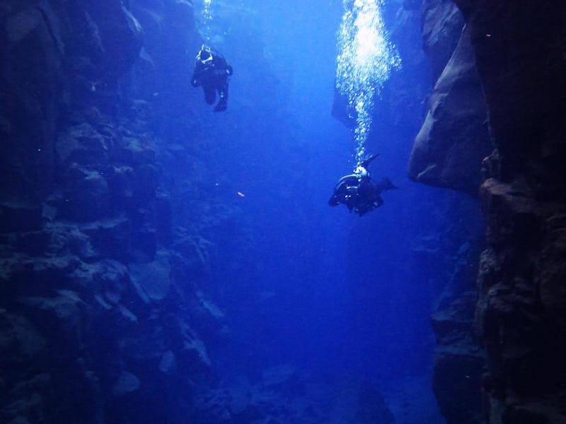 According to the video makers, the two land masses are drifting apart 2 centimeters a year, leaving this canyon riddled with valleys, volcanos, and faults in between—where the water is extremely clear due to filtration through underground lava.