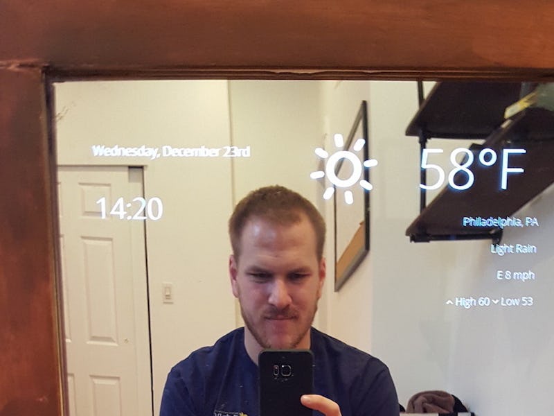 By gutting a monitor that runs on a simple computer and placing it behind a thin two-way mirror that he fitted into a wood frame, Pierce created a widget-based smart mirror that can do such handy tricks as tell you the weather or list the latest top news stories, depending on how it’s programmed — the limits are really whatever you want to do with it. The mirror also — ta daaaaa! — shows you your reflection. It’s a basic version of the kind of sophisticated on screen displays you’ve seen for decades in sci-fi movies like Minority Report and Total Recall, except he made it easy to build. I talked to Pierce about his DIY tech, what he feels about his idea taking off on the internet, and how technology like this can eventually become normal in our everyday lives.