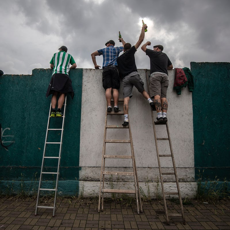 Football fans raise their drinks as they stand on ladders to peer over a wall as they watch a Czech First League match between Bohemians 1905 and FK Jablonec at Dolicek Stadium on June 14 in Prague. Matches are closed to the public.