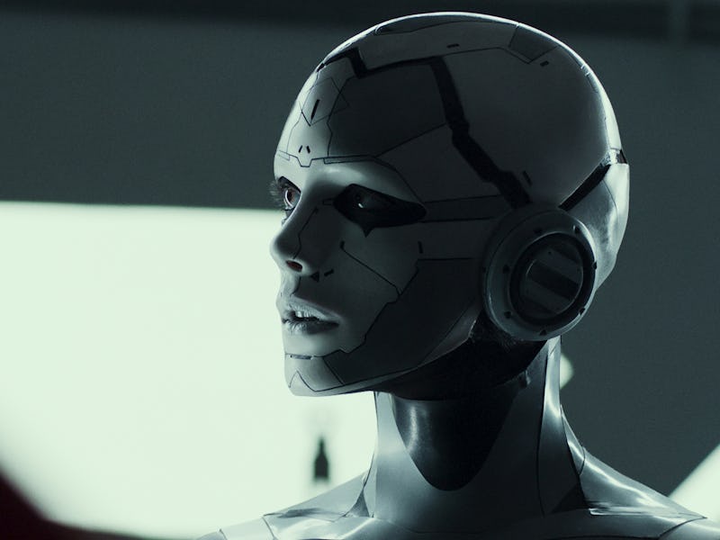 But Archive's most charming characters, J1 and J2, take Rothery's love for art to the next level. Created by Rothery in 3D and brought to life by his art department, the robots of Archive were performed by ex-Cirque du Soleil performer Timea Kinga Maday (as J2) and Chris Schubert (as J1), who had built the costume of J1 himself.