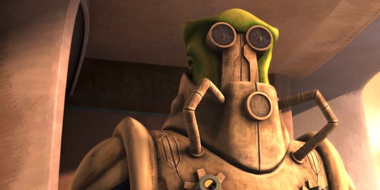 The Clone Wars wouldn't be so wonderfully weird without the inclusion of an extra-hilarious prequel character like Wat Tambor. First seen in Attack of the Clones, he's the faux-steampunk foreman of something called "The Techno Union Army," which claims to be a neutral party in the war. However, we know they're working with Count Dooku and the Separatists, mostly because Tambor's big line of dialogue in Attack of the Clones was, "The Techno Union Army – various floopy-bloop robot noises – is at your disposal, Count."