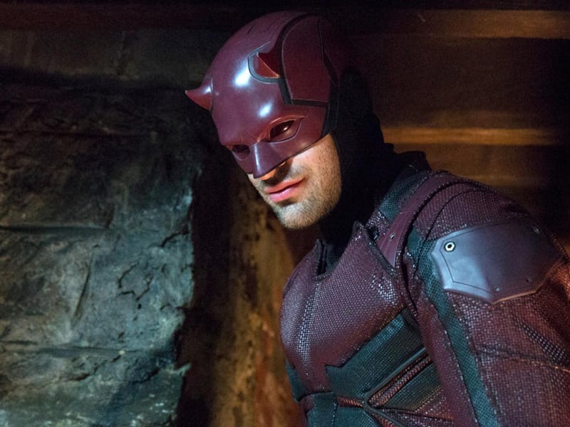 In the final moments of the episode, Matthews picks up a box left out in the open of his studio while chiding his coworker for needing to be more secretive. The camera lingers over the open box to reveal Daredevil’s new horned yellow helmet.