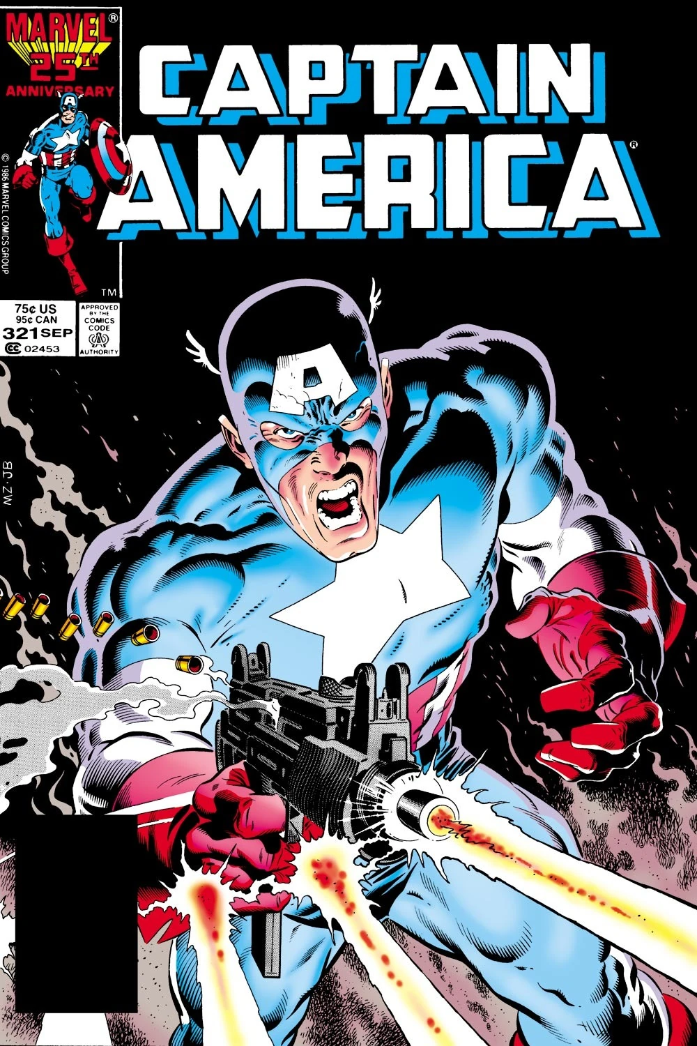 Walker allowed Gruenwald to “better define what Captain America the concept is by seeing someone groping, trying to live up to it, trying to grasp all the facets of the concept.” At the same time, John Walker’s darker, more violent streak caught on with readers. It was the late ‘80s, when the popularity of morally gray characters like the Punisher and the Rambo film franchise made readers roll their eyes at Steve Rogers’ wholesomeness. (Gruenwald said the cover to Captain America issue #321, with Captain America guns blazing, was a best-seller.)