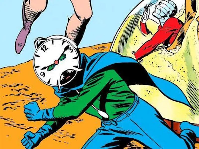 Doctor Tyme’s first comic book appearance was in 1964’s Doom Patrol #93: The Sinister Secret of Dr. Tyme. His attempts to rob a plane draw the attention of the Doom Patrol. Their run-in proves how formidable a villain Doctor Tyme can be, using his helmet to freeze, slow down, or stop time completely.