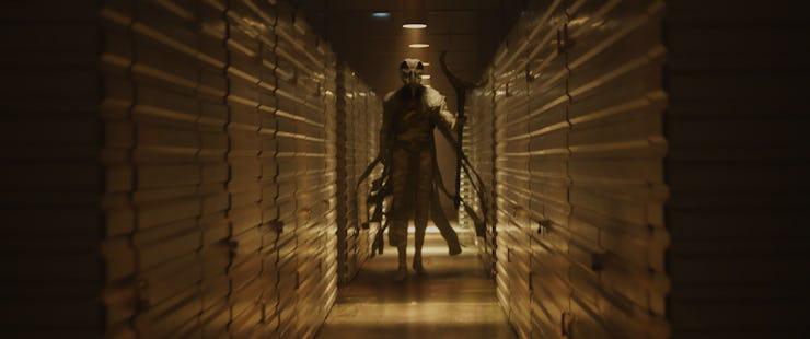Khonshu looking down a hallway at Steven Grant (Oscar Isaac) in Moon Knight Episode 1.