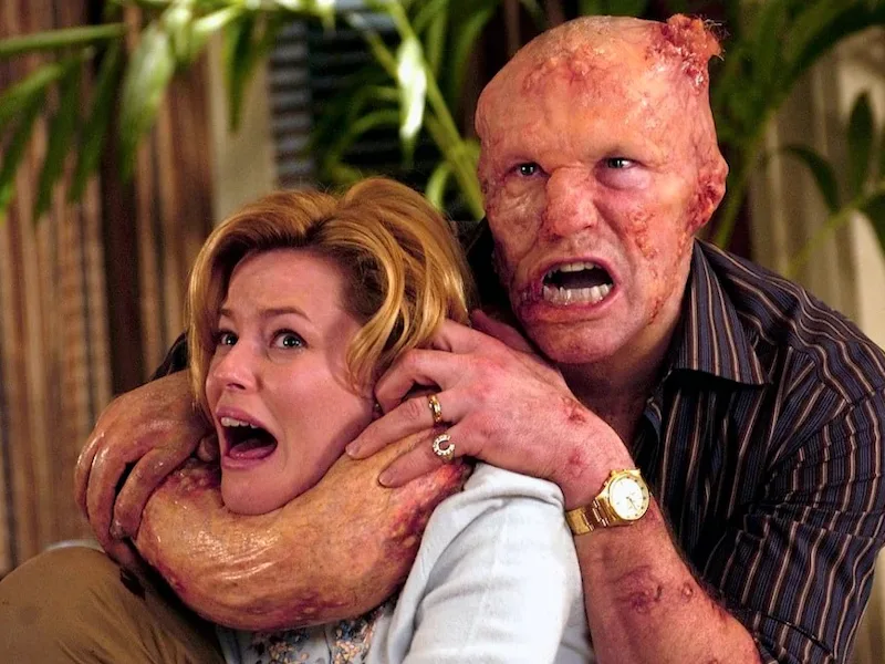 Like any good retro-inspired sci-fi horror movie should, Slither takes place in a quaint small town: Wheelsy, South Carolina, home of an annual deer hunt and basically nothing else. We meet a few of the locals, including police chief Bill Pardy (Nathan Fillion), his childhood friend and permanent crush Starla (Elizabeth Banks, doing a fun Southern accent), and her husband Grant (Michael Rooker), whose most attractive asset is his bank account. This love triangle doesn’t go away, exactly, when Grant gets infected by a billion-year-old galaxy-hopping parasite. But it does take a back seat to the more urgent business of squashing the thousands of space leeches that are turning the residents of Wheelsy into mindless zombies.