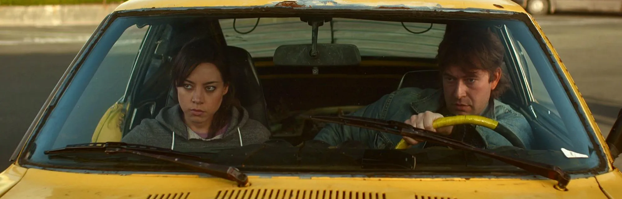What then unfolds would appear to be a rudimentary romantic comedy, if not for the time travel stuff and the eccentricities of leads Plaza and Duplass, each playing up themselves as authentic outsiders to Hollywood’s plastic molds. Filmed during Plaza’s stint on Parks and Recreation, Darius is less morbid than April Ludgate, though I imagine the two would get along well debating Bloc Party albums. Duplass’ Kenneth, meanwhile, looks like a dumpier John Krasinski, with disheveled brown locks and a tight denim jacket who drives around in a beat-up yellow Datsun.