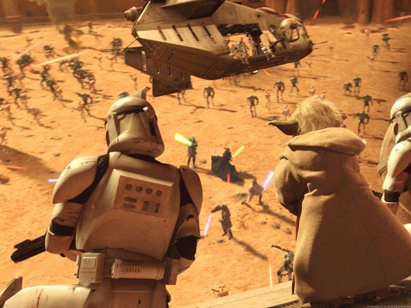 Weirdly, the Clone Wars is also a civil war like the one central to the original trilogy. But, in the OG films, the "good guys" are the Rebels, and the bad guys, the establishment, are the "Empire." If you leave out the fact that the same person was technically in charge of both armies, the Clone Wars is a flip of the civil war in the classic trilogy because the "good guys" are the clones and the Jedi fighting for the establishment, which ends up working — just not the way they thought.
