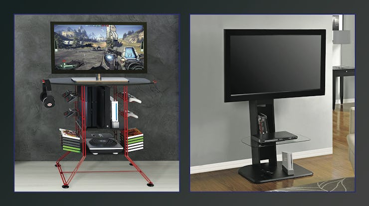 Gaming is a hobby that can come with lots of cables, consoles, and accessories, so when you’re choosing a TV stand, you’ll want to look for options with plenty of storage and convenient access points. Some stands have specialized storage for organizing games and controllers, while others simply have storage that could work for gamers. Some entertainment centers with cabinets have a lot of space to offer if you’d rather not stash your gear out in the open, too. An open back or multiple ports for cord management can make switching between different game consoles less of a hassle. Finally, it probably goes without saying, but before you commit to the TV stand of your dreams, make sure it can handle the weight and size of your gaming TV, and that it fits well in your space.