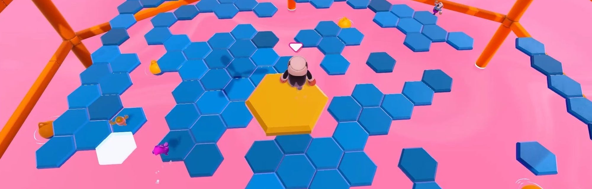 This summer's gaming obsession gives players control of a bean-shaped contestant that must tumble its way through quirky obstacle courses to be the last critter standing out of a pool of 60. One particular event, Hex-a-Gone, consists of a column of hexagon-shaped panels that disappear once someone steps on them. To fall into the slime pit below means instant elimination.