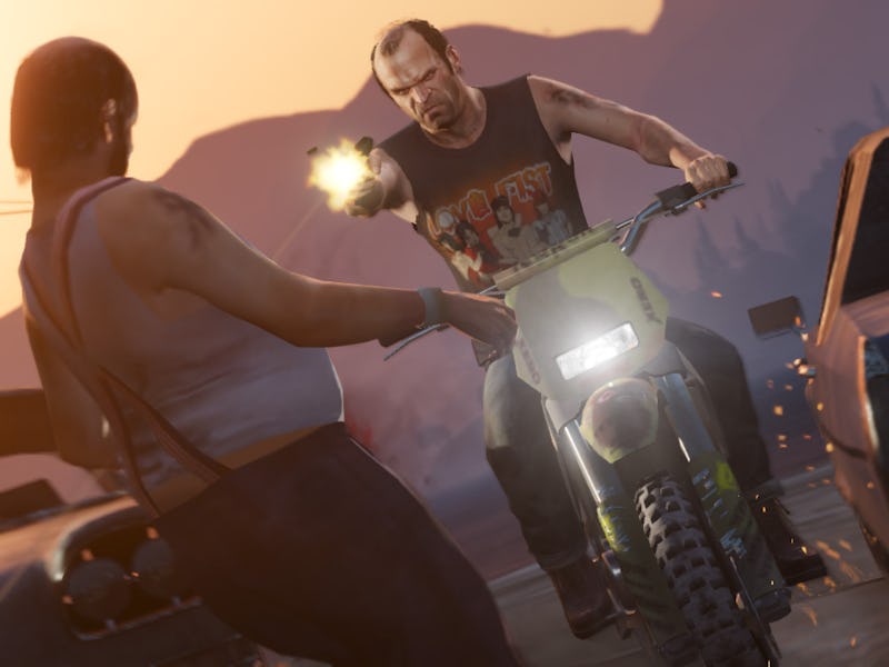 The three Grand Theft Auto 5 protagonists from left to right: Franklin, Michael, and Trevor.