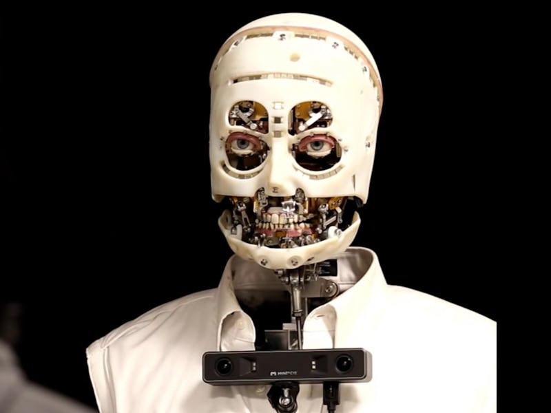 Dressed to impress — Oh. Right. It still looks like a soulless, skinless, leering killbot made even worse by those horrid teeth and that "dress shirt" getup they put on its torso. This "realistic and interactive robot gaze" as described by Disney Research is admittedly a major step forward in terms of animatronics meant to simulate real human interaction, but that's not exactly comforting, either.
