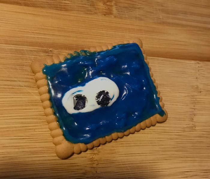 What you'll need — Patience. I had none. So I went ahead and bought some colored icing in white, dark blue, and light blue. I also purchased a small bottle of blue sugar and sprinkles from the local Pavilions. To be clear, I had no idea what the hell I was doing. I attempted to follow this YouTube tutorial on making the perfect Sonic the Hedgehog that does not, in fact, look like a demonic creature. Here is my first attempt.