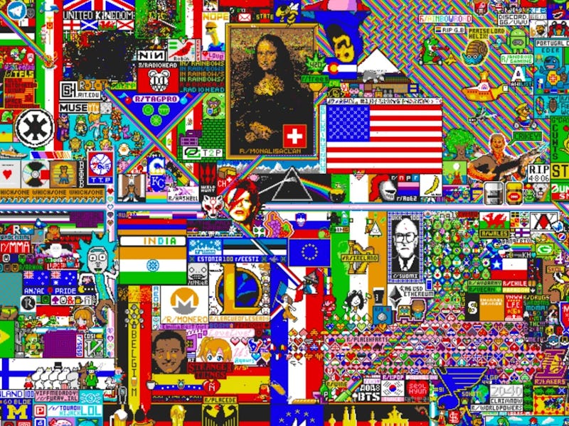 A battle emerged between a blue corner and a red corner, each plotting to dominate the board, and then a group called r/BlackVoid cropped up to blot out any progress. Another squadron put forth a plan to place an American flag in the center, and eventually there was a Mona Lisa, flag of India, and a smorgasbord of meme ephemera. It was the internet in all its glory. It was a chaotic; it was low-brow; it was beautiful.