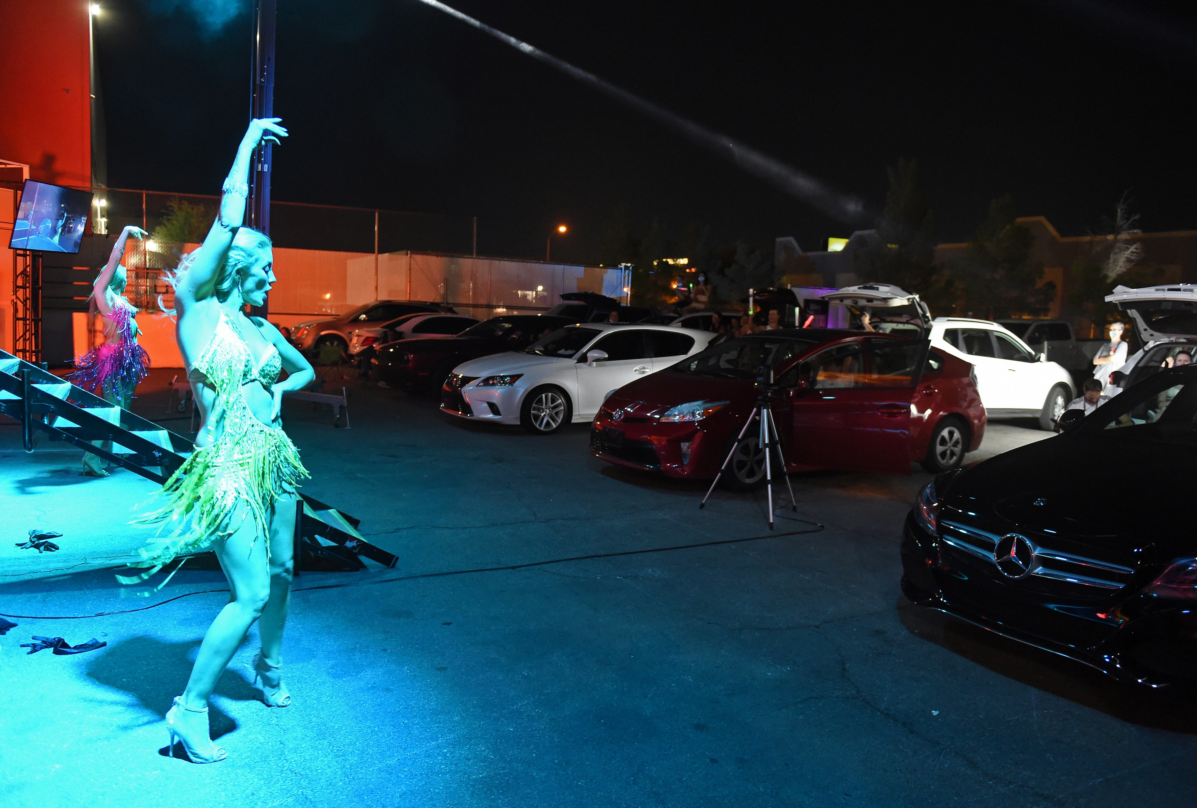 Cast member Sydnie Kinderman gets ready backstage before a COVID-19-era drive-in performance of "SEXXY: The Show" on July 1, 2020 in Las Vegas, Nevada.