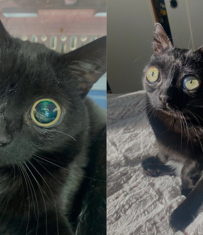 After Mia found Jinx in a field in 2018, she took the kitten in and started sharing photos online. Mia says that despite the birth defects that cause the cat’s jarringly massive eyes and feet, the vet says she’s healthy. All hail mayor Jinx!