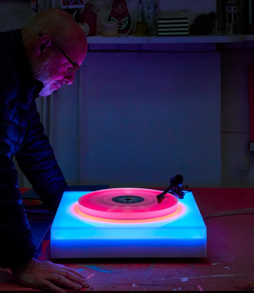 “The light from it was tangible as if caught in a cloud of vapor,” Eno said about the turntable. “We sat watching for ages, transfixed by this totally new experience of light as a physical presence.”