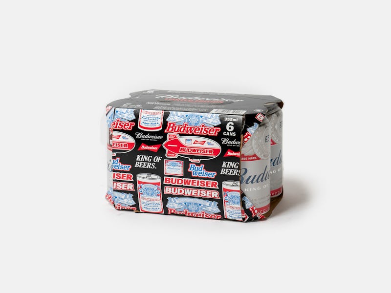 Horiuchi, who's now in New York City as part of LQQK Studio, went with a more head-on approach to the past. His collage bandana combines several old Budweiser logos with a classic can and vintage blimp. The T-shirt keeps it simpler with the can on the front and a broken-up logo on the rear. The latter motif can also be seen on two different packaging treatments.