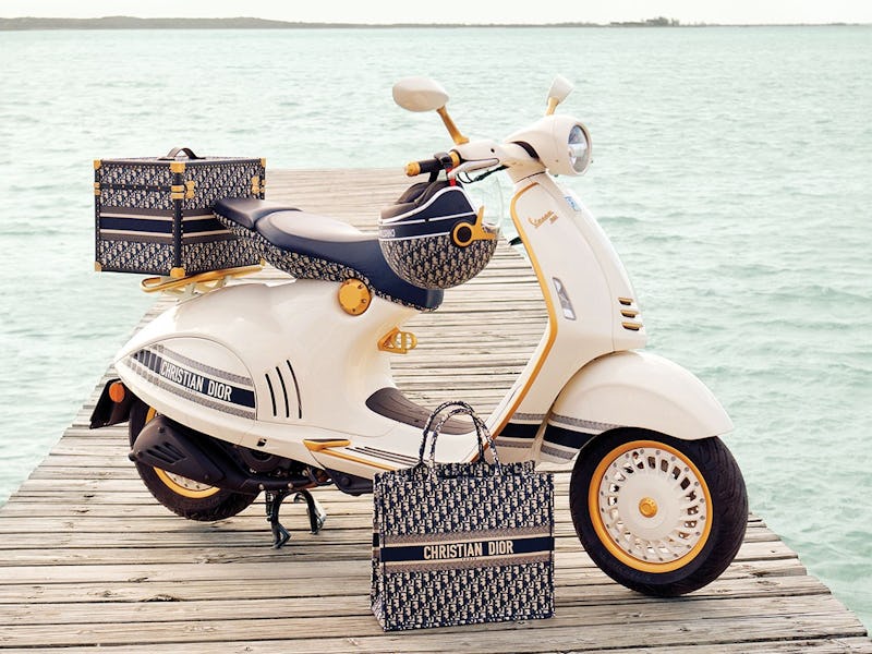 Dior has unveiled a Vespa 946 scooter as envisioned by womenswear director Maria Grazia Chiuri. The limited-edition scooter is expected to hit stores in 2021 and is fully decked out in the French house's signature Oblique print. As if that weren't enough, "Christian Dior" is slapped onto the fender to make the brand's tote bags seem modest.