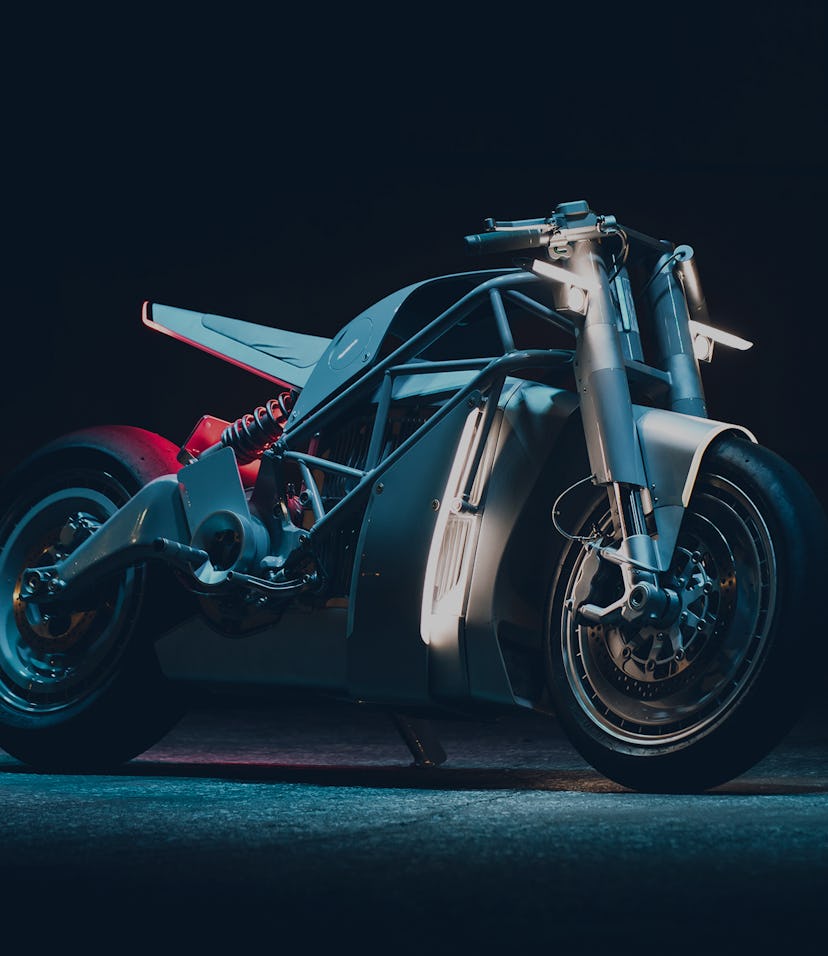 Most of the exterior consists of custom CNC machined panels and there’s illumination aplenty. A pair of potent LED headlights are discreetly tucked beneath painted aluminum winglets. Those winglets have translucent leading edges with strips of amber LEDs inside that serve as indicators. Similar LED strips appear in the fork covers, heel guards, and under the seat / tail above the rear shock absorber. The tail’s LED strips serve as regular rear lights, brake lights, and indicators.