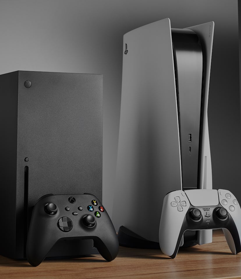The PlayStation 5 console mock box mimics the actual console's gargantuan dimensions: it is about 16 inches tall, almost four inches long, and about nine inches wide. The Xbox X Series console mock box is a comparatively restrained 12 inches tall, and six inches deep and wide.