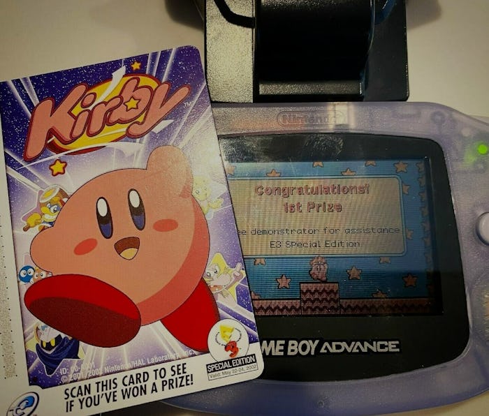 The Kirby card was distributed randomly among e-Reader packs given out by Nintendo reps during the convention. A scan of the rare card with one’s GameBoy Advance e-Reader attachment prompted a first-place congratulations message, with instructions to see one of the reps for a prize — reportedly a Limited Edition Gold Gameboy Advance Pokemon/NYC Store Limited Edition handheld, which sounds pretty badass, to be honest.
