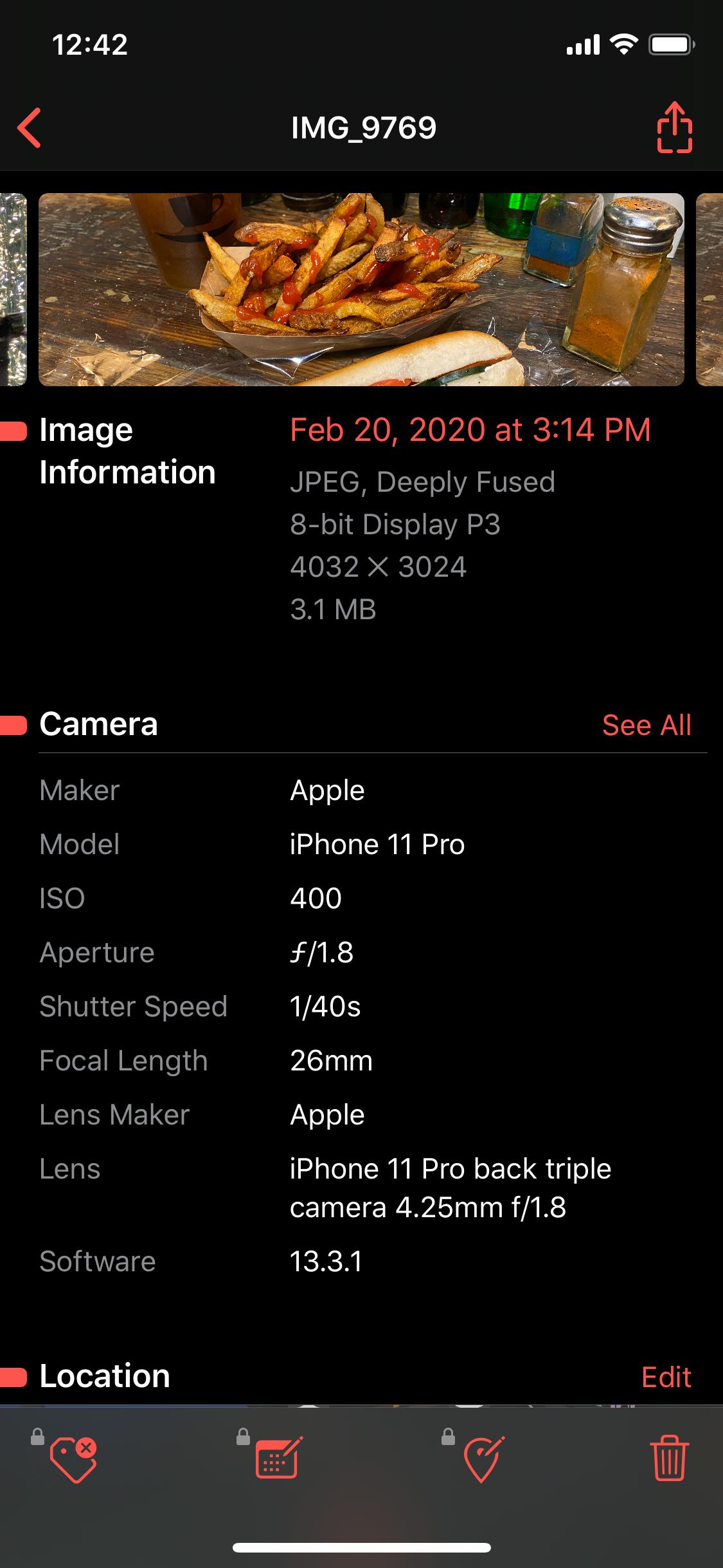 Examine the bread in the S20 Ultra and iPhone 11 Pro shots below at 100 percent crop. There's more visible texture in iPhone photo with more highlights and sharpness. How is this possible? The iPhone's "Deep Fusion" technology, which uses machine learning to process a photo and enhance details. By default, there's no way to see if a photo used Deep Fusion or not; the mode is automatic and there's no way to manually turn it on. However, using the Metapho app, I confirmed the photo did indeed use Deep Fusion, which is likely why the details are so clear.