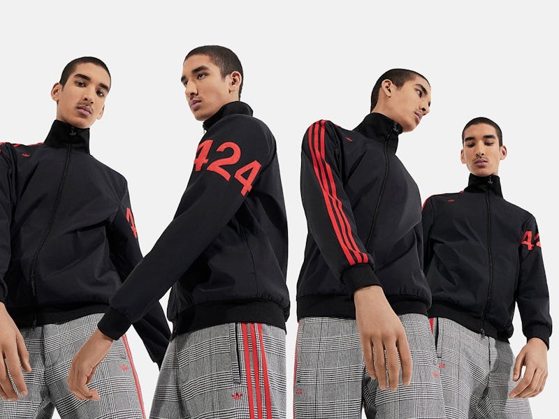 A uniform that's less so — The black-and-red tracksuit Run-DMC once wore has been reimagined with kimono-like construction on the jacket and asymmetrical branding on the pants, countering a tiny Adidas trefoil logo with an oversized "424." It's styled without a shirt on the model, which could absolutely be a look for those brave enough to try it. I, however, do not have the courage — but it doesn't make the set any less covetable.